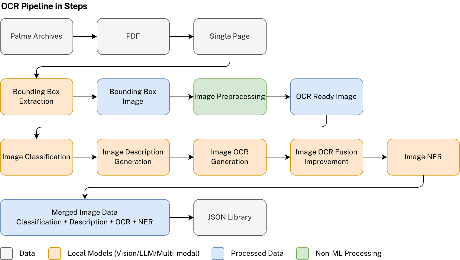 To overcome this, we built a multi-stage OCR pipeline capable of analysing each page region by region. The system detected where text, images, tables, or maps appeared and then routed those segments through specialised models tailored to their content. This approach allowed us to transcribe text, generate structured image and map descriptions, and extract relevant named entities.