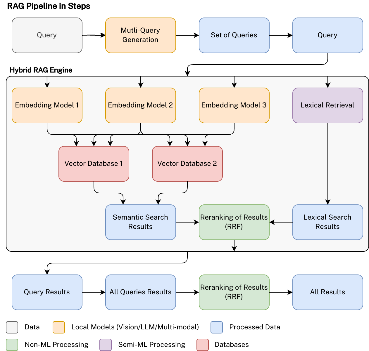 We built a hybrid semantic search system combining several vector databases, powered by a set of different embedding models. Each model captured different nuances of meaning, and the system additionally used a lightweight language model to generate richer, more targeted search queries. The results from each retrieval path were fused and re-ranked using reciprocal rank fusion (RRF), creating a unified and highly reliable semantic search pipeline that could surface the most relevant information from across the entire dataset. Especially combining a hybrid RAG system, with a multi-query generation, allowed us to start diving deep into tons of information.